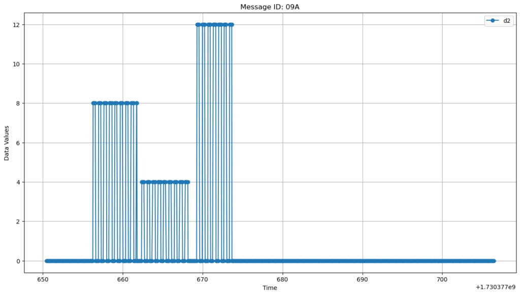 Users can select a specific message ID to visualize how its values change over time. This feature is particularly useful for manual signal analysis. The example below demonstrates how message bits change when the turn signals and hazard lights are activated sequentially.